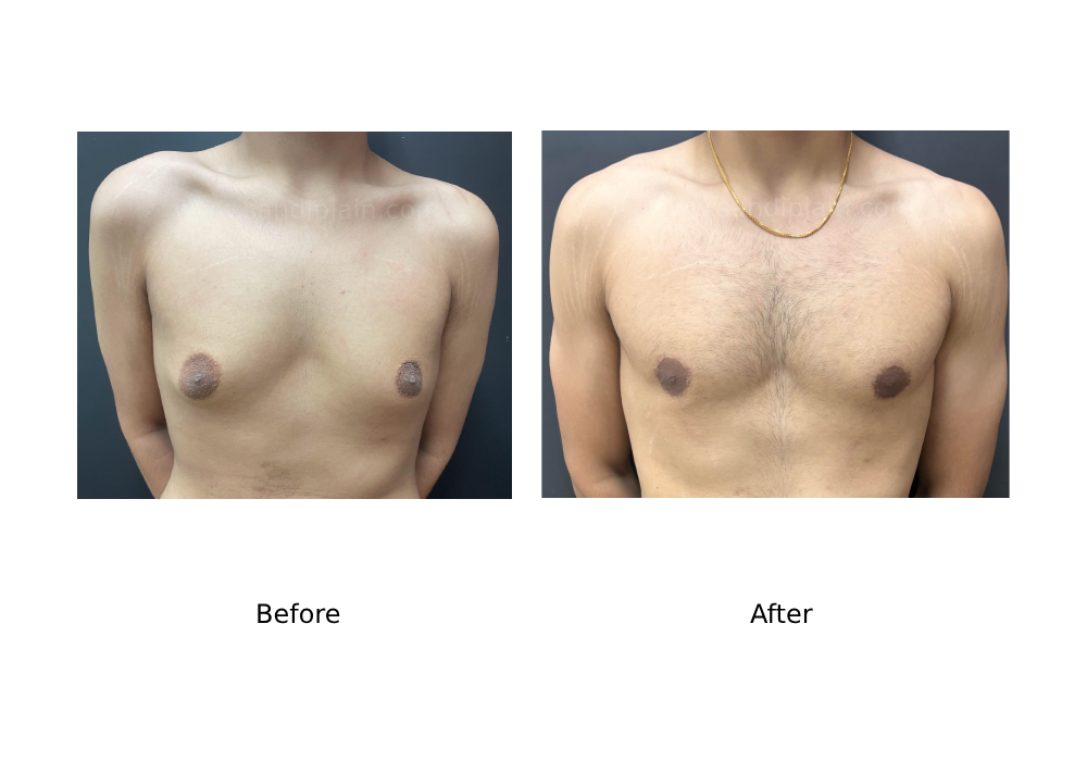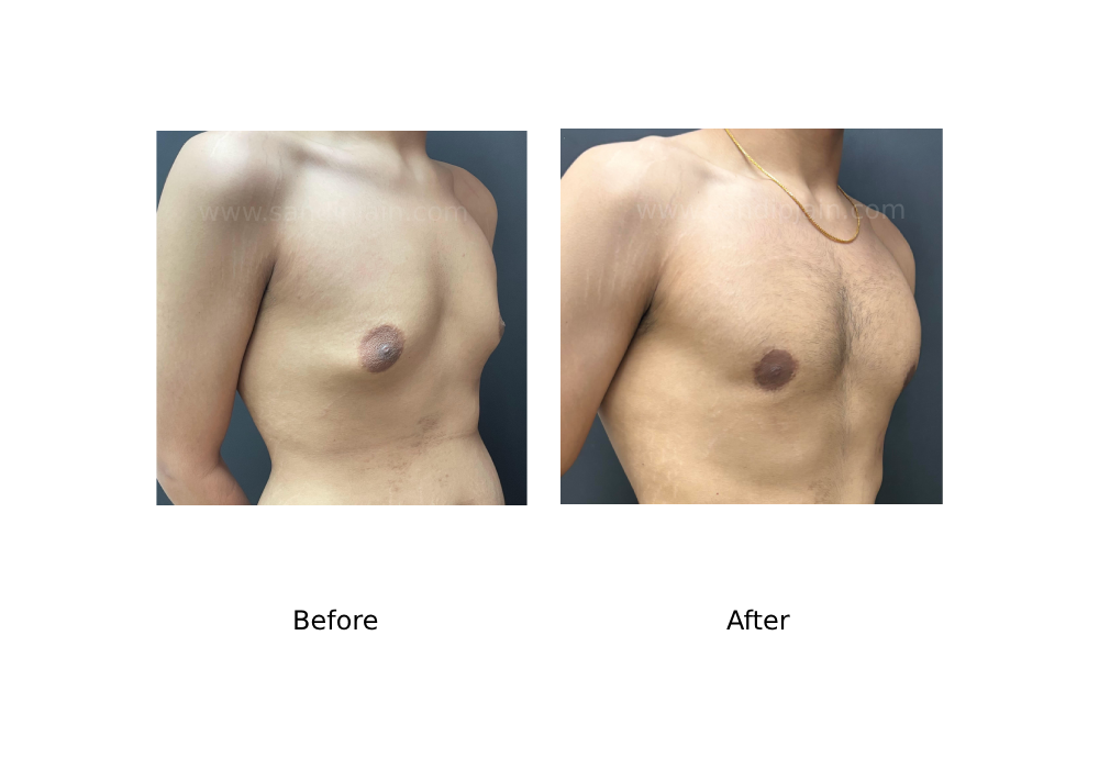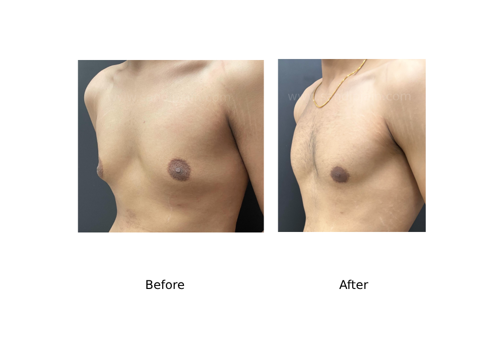 2024 year old with severe gynaecomastia affecting both sides. There is severe gland enlargement (more then 10 cms), fat deposit around the gland and loose hanging skin. Gland excision, liposuction and in addition skin tightening was done for this patient.