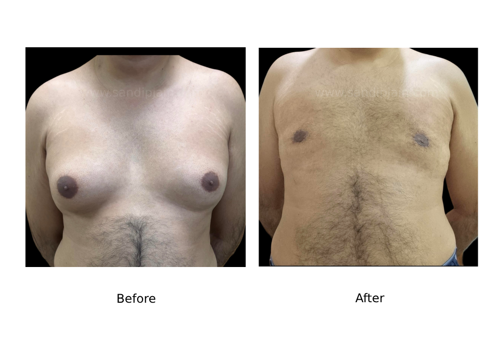 Before: grade 2 gynaecomastia After: following gland excision, lipo and skin tightening