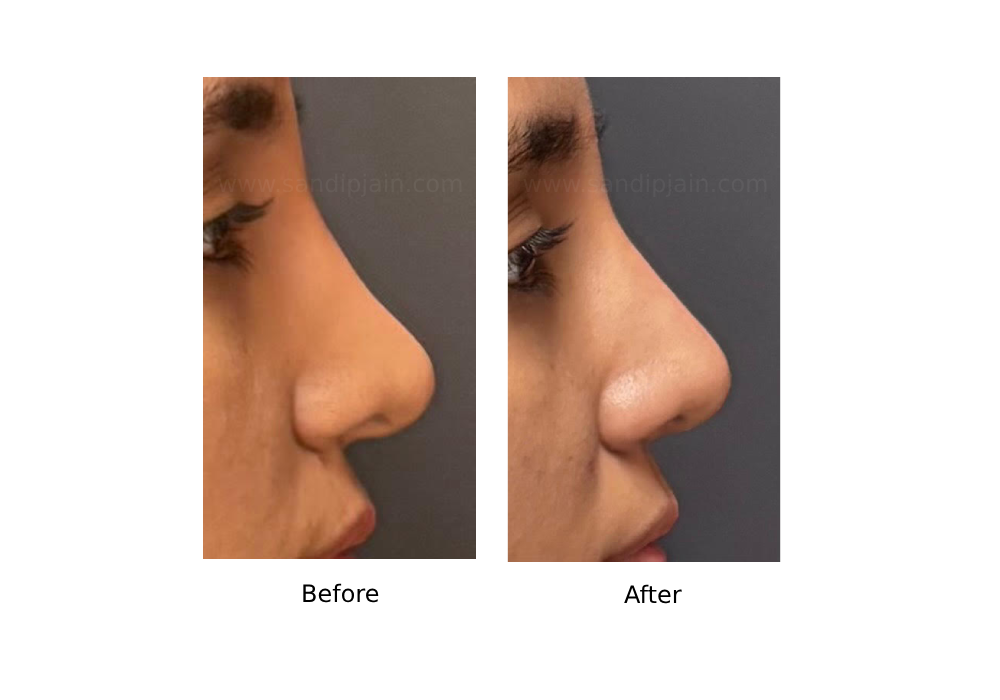 Before: same patient side view showing depressed bridge After: following septorhinoplasty showing straight bridge