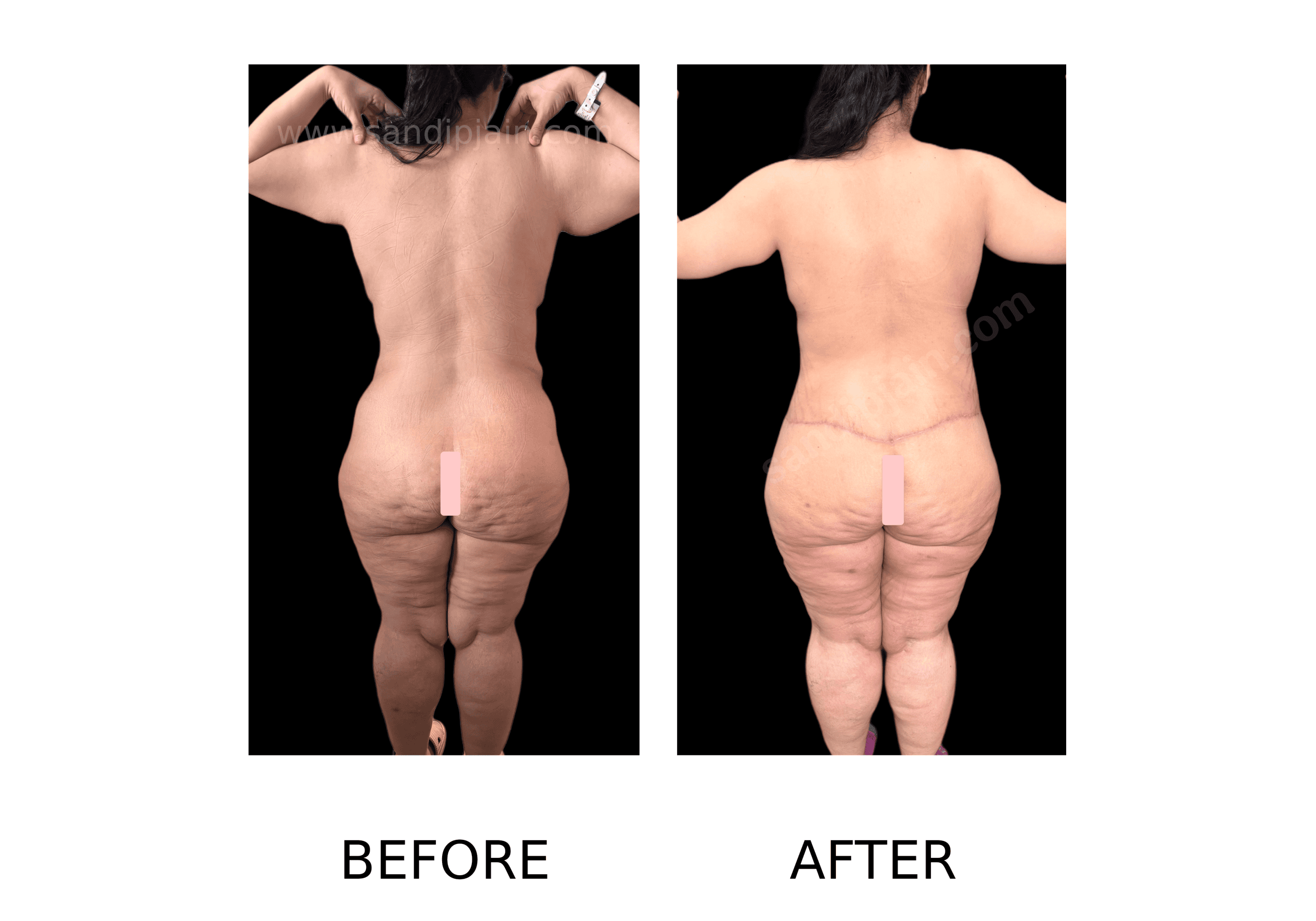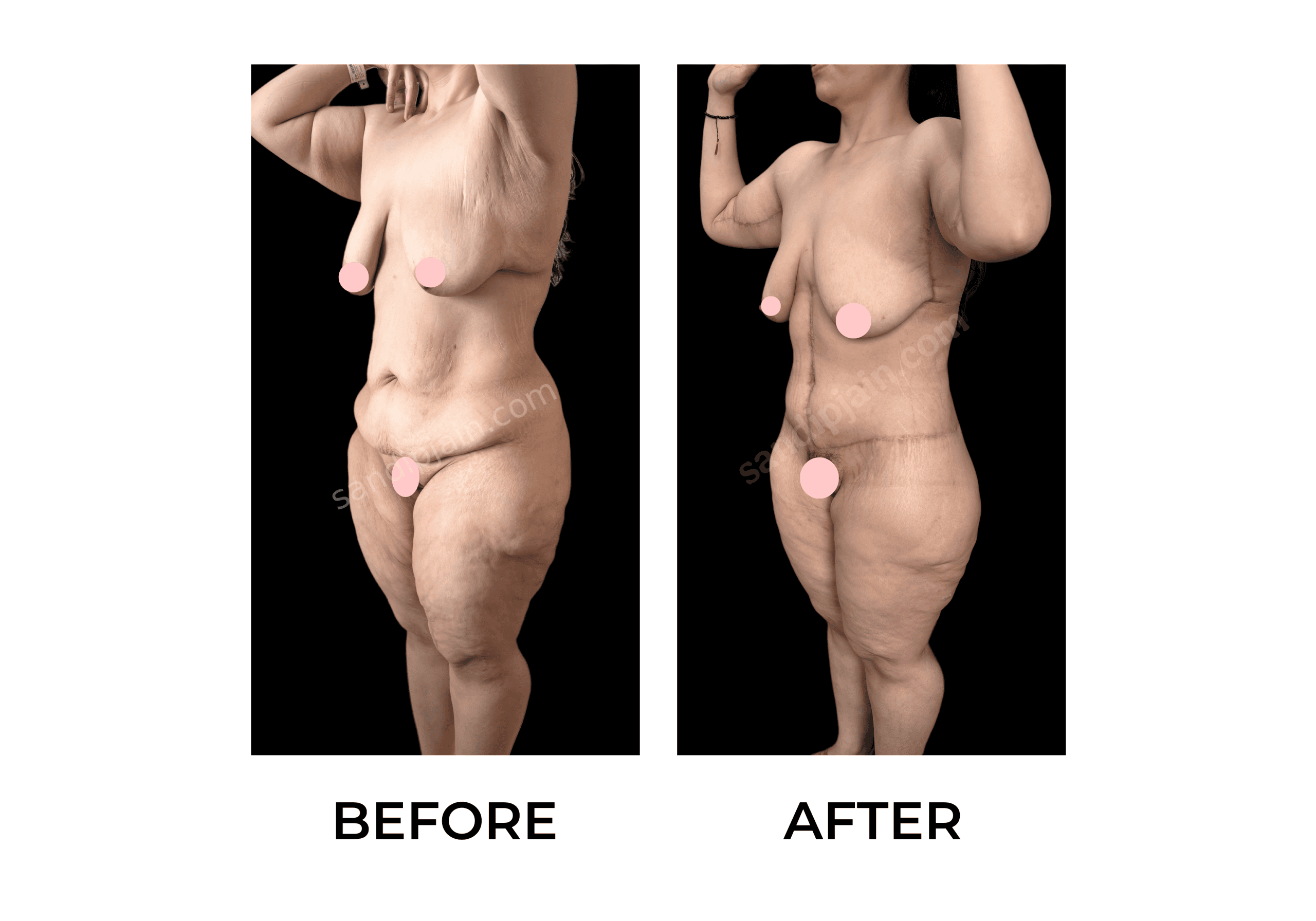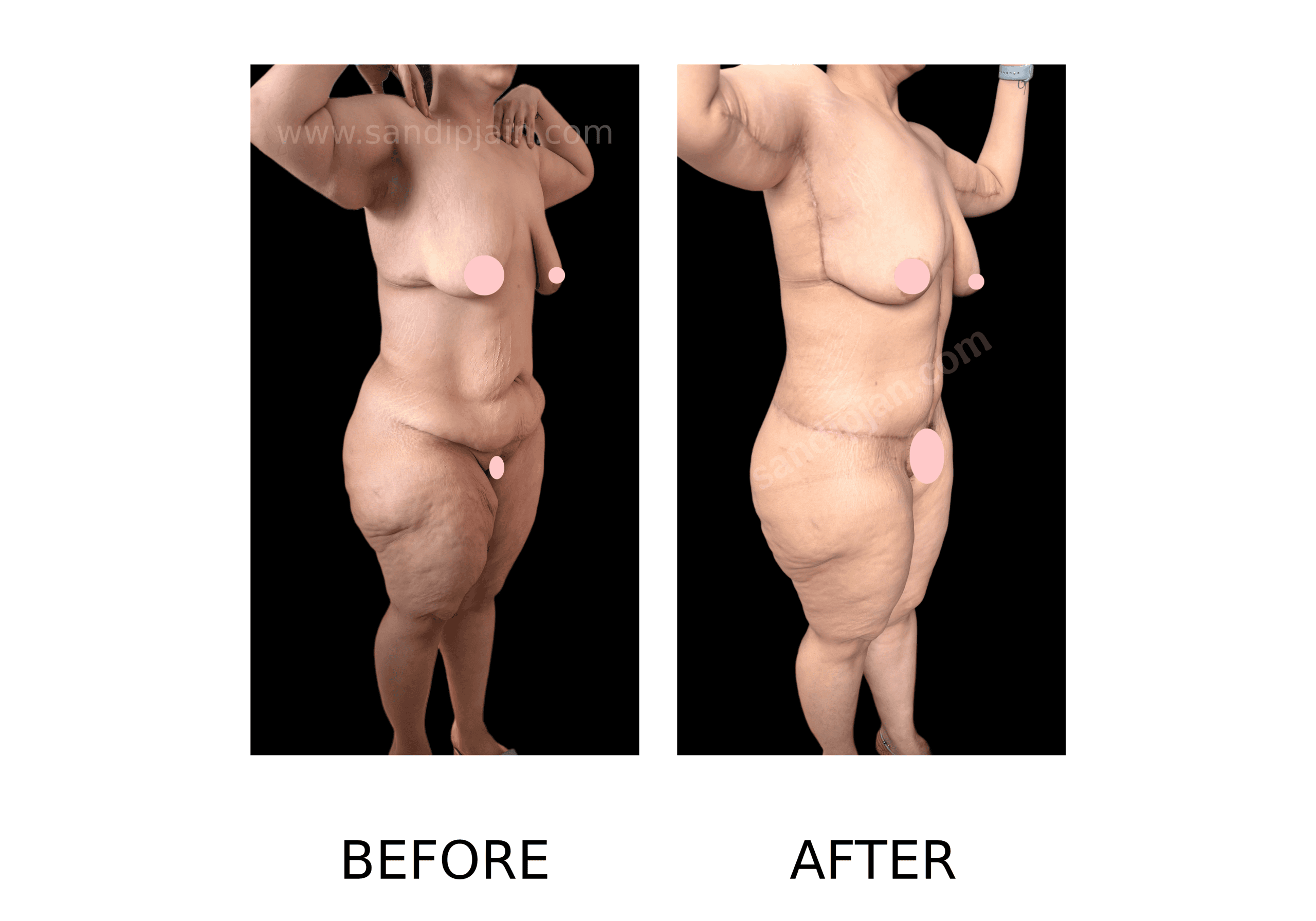 21 rbr 33 year old, 50 kg weight loss following bariatric surgery. Underwent two stage total body lift. first stage lower body lift and thigh lift was done. One month later, the 2nd stage, breast lift with enhancement (using implants) and arm lift was done.